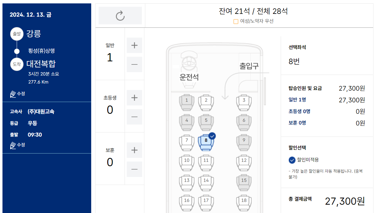 예매 완료 후 좌석을 변경하려면 기존 승차권을 취소하고 새롭게 예약해야 합니다. - 성수기와 공휴일: