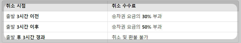 - 출발 3시간 이후 취소: 승차권 요금의 50% 취소 수수료 부과