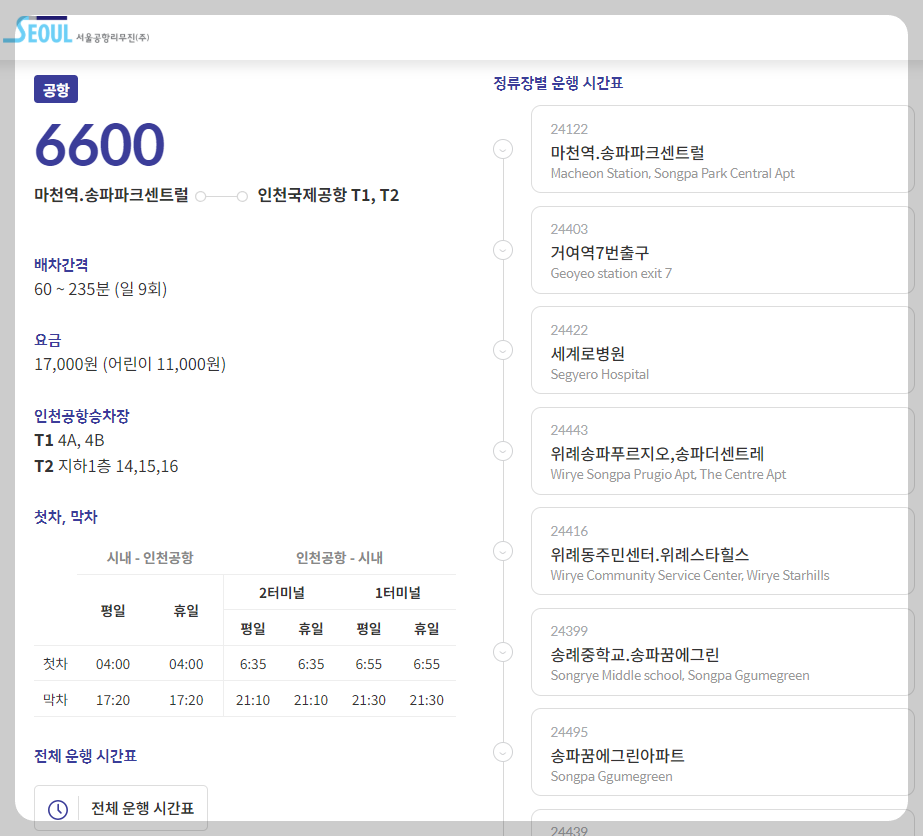 | 마천역·송파파크센트럴 | 04:00 | 17:20 | 60~235분 |