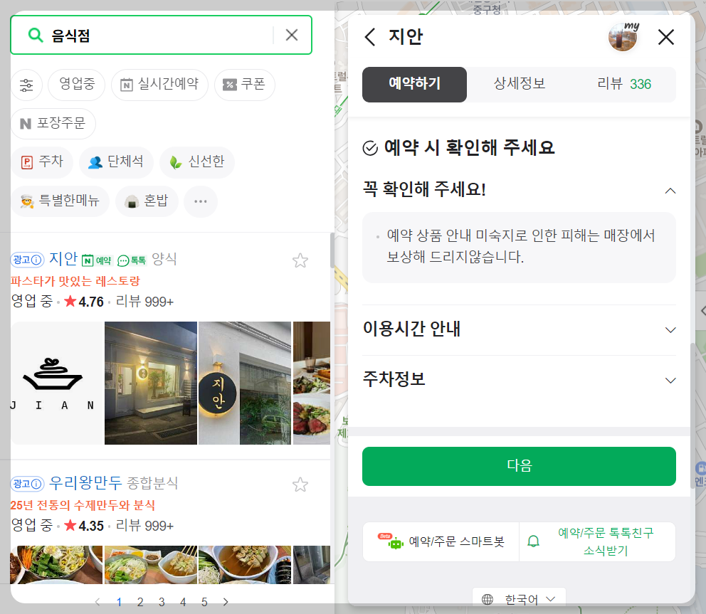 특히 야구장 개막식이나 주말 및 공휴일에는 많은 인파가 몰려 맛집 대기줄이 길어질 수 도 있겠는데요. 이럴 때는 미리 맛집 예약을 2~3일전에 미리 해두시는 것이 좋습니다. 네이버 예약 서비스를 이용해 빠르게 예약이 가능합니다. 어렵지 않으니 미리 예약하셔서 불편함없으시길 바랍니다.
