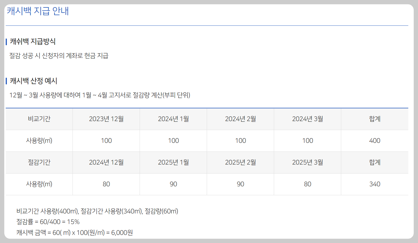| 캐시백 지급 단가 (원/m³) | 50원/m³ | 100원/m³ | 200원/m³ |