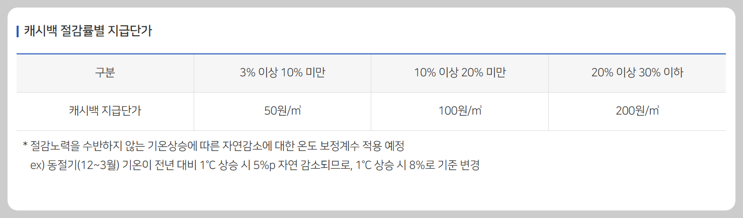 캐시백 지급 단가 (원/m³) | 50원/m³ | 100원/m³ | 200원/m³ |