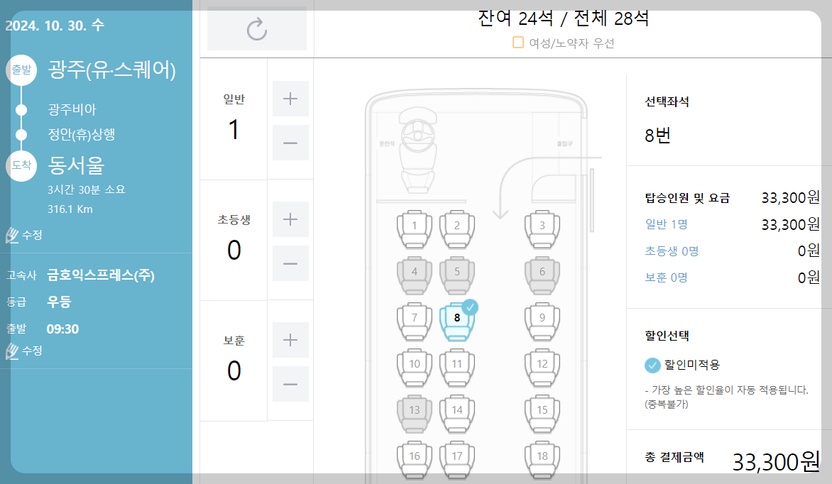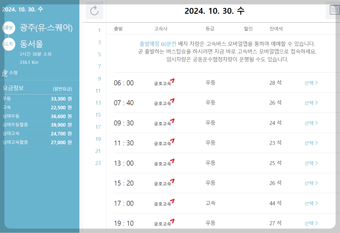 - 주말, 공휴일에는 인기 노선이 빠르게 매진되니 최소 하루 전에 예약하세요.