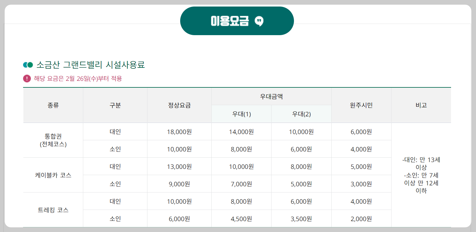 원주의 자랑, 소금산 그랜드밸리의 출렁다리만 이용할 수 있을지 궁금하실텐데요. 소금산 출렁다리는 단독 이용이 불가능하며, 소금산 그랜드밸리 입장권을 구매해야 이용할 수 있습니다. 요금표는 아래에 정리해두었는데요. 코스마다 다르며 케이블카 이용시 요금표도 따로 있으니 참고하시길 바랍니다.