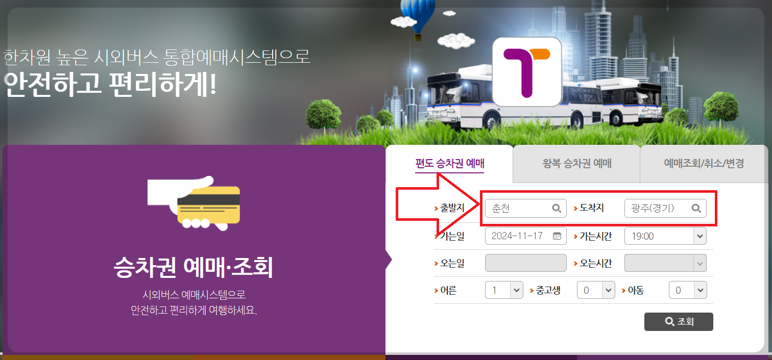 2.출발지와 도착지, 날짜를 선택하고 원하는 시간대를 입력합니다.