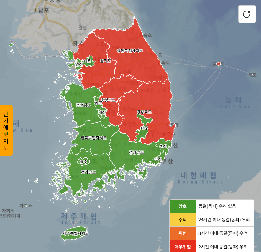 각 지역별로 수도 동파에 관한 위험도를 한 눈에 볼 수 있습니다. 미리 확인하셔서 대비하세요.