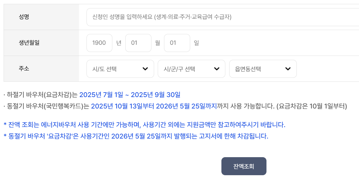 에너지바우처는 신청 기간 내에만 신청하면 → 하절기 + 동절기 전체 금액을 사용할 수 있습니다. 단, 신청 시점이 늦을수록 하절기 요금 차감이 지연되거나 누락될 수 있으므로 ✅가능한 빨리 신청하는 것이 좋습니다.