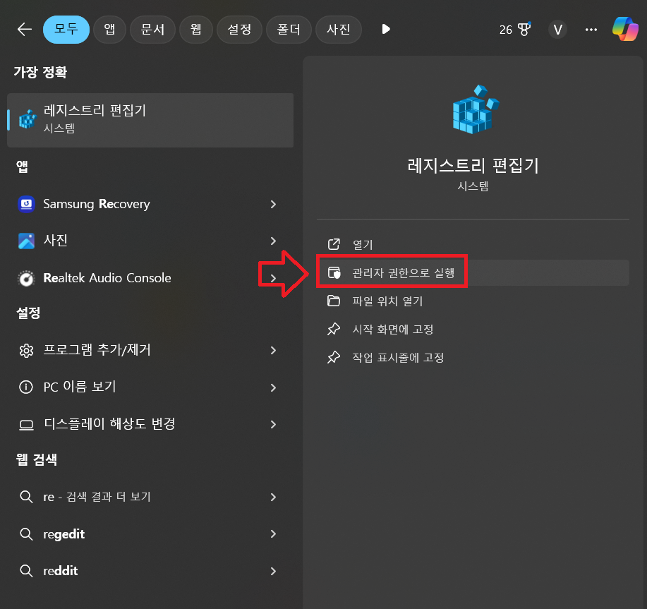 1️⃣ 윈도우 시작 메뉴에서 regedit을 입력하고 실행합니다.