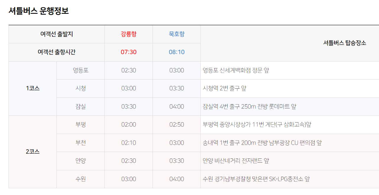 | 지역 | 출발시간 | 탑승장소 |