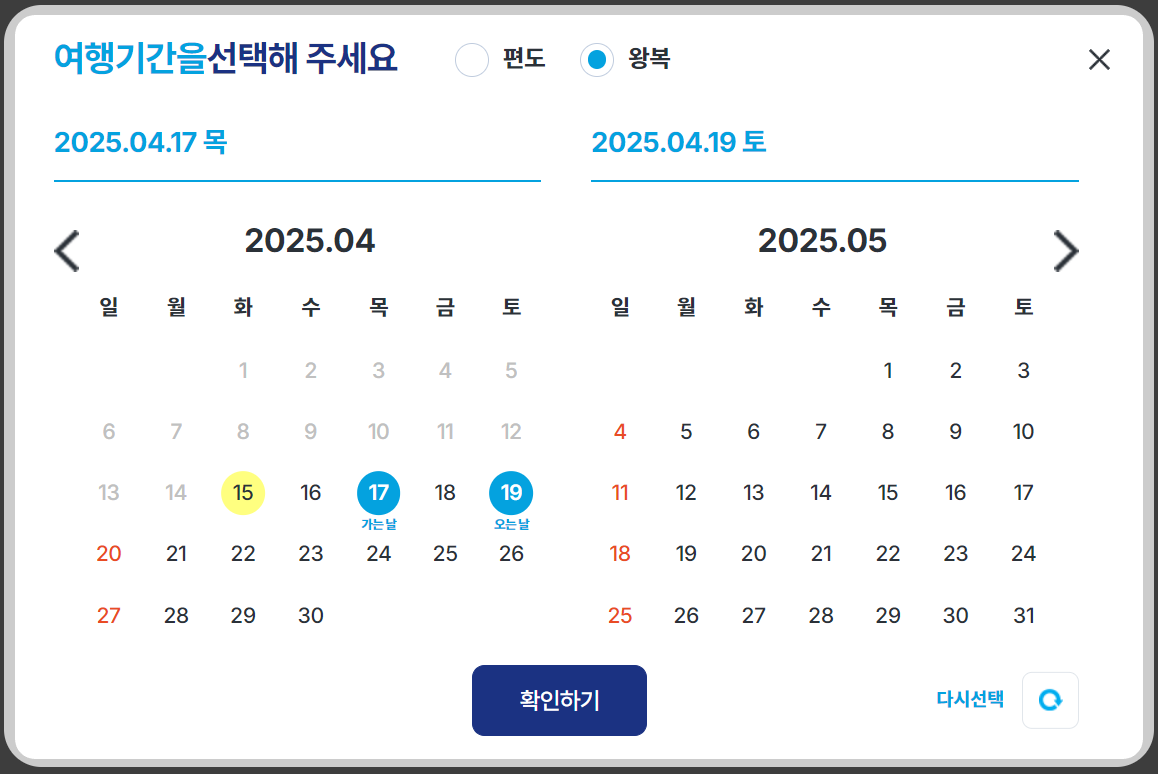 우선 여행 날짜를 정해주세요. 가는 날과 오는 날을 모두 선택하면 자동으로 왕복 조회가 되니 편리하답니다.