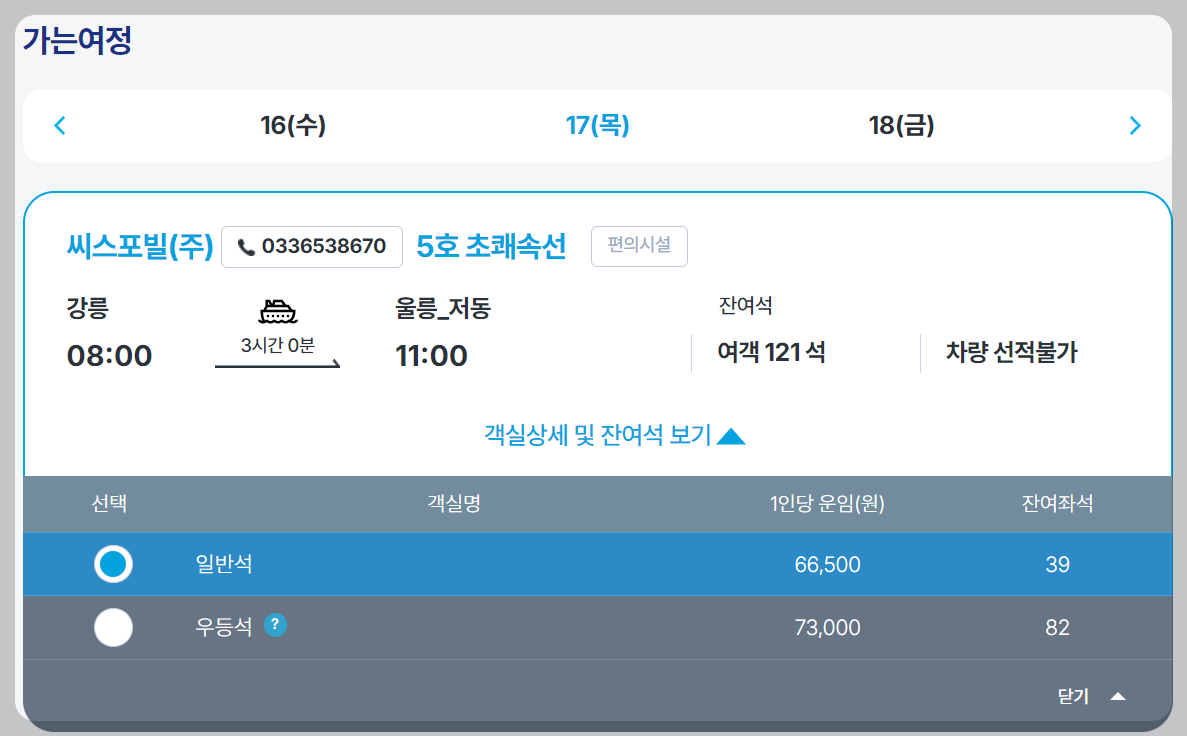 일반석도 충분히 쾌적하지만, 조금 더 여유 있는 여행을 원하신다면 우등석을 선택해보세요. 가격 차이는 약 6,500원, 그래도 바다를 여유롭게 감상할 수 있다는 점에서 가치 충분!