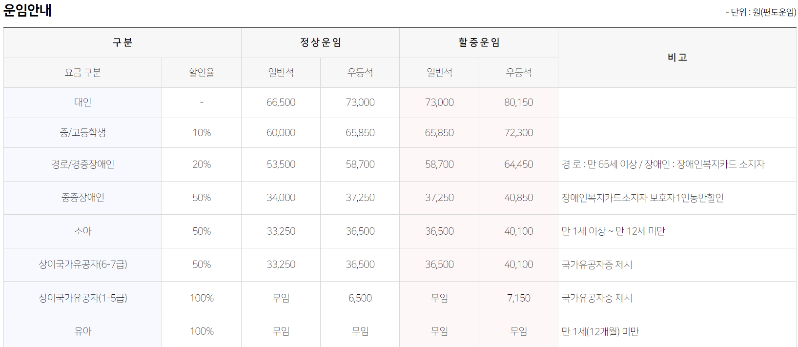 (중고생, 장애인, 국가유공자, 유아 등은 할인 혜택이 꽤 큽니다!)