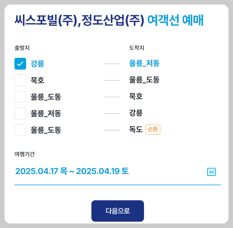 모든 정보를 확인했다면 '다음'을 선택해주세요. 결제까지 마치면, 울릉도 여행 준비가 완료됩니다.