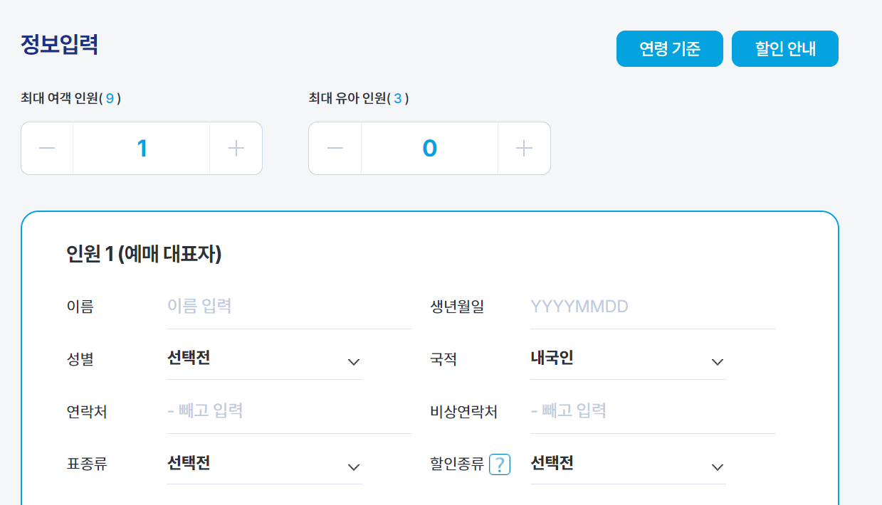 이제 탑승자 정보를 입력하는 단계! 이름, 생년월일, 연락처 등을 작성해주시면 됩니다. 할인 대상자라면 꼭 체크하세요.