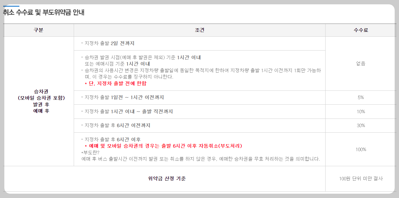 | 출발 1일 전 ~ 1시간 전까지 | 운임 요금의 5% |