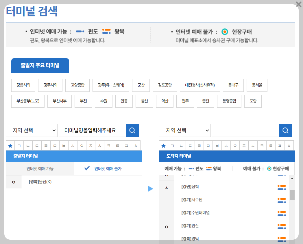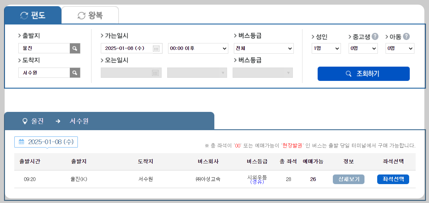 1️⃣ 출발지/도착지 입력: 출발지를 ‘울진’, 도착지를 원하는 도시로 선택하세요.