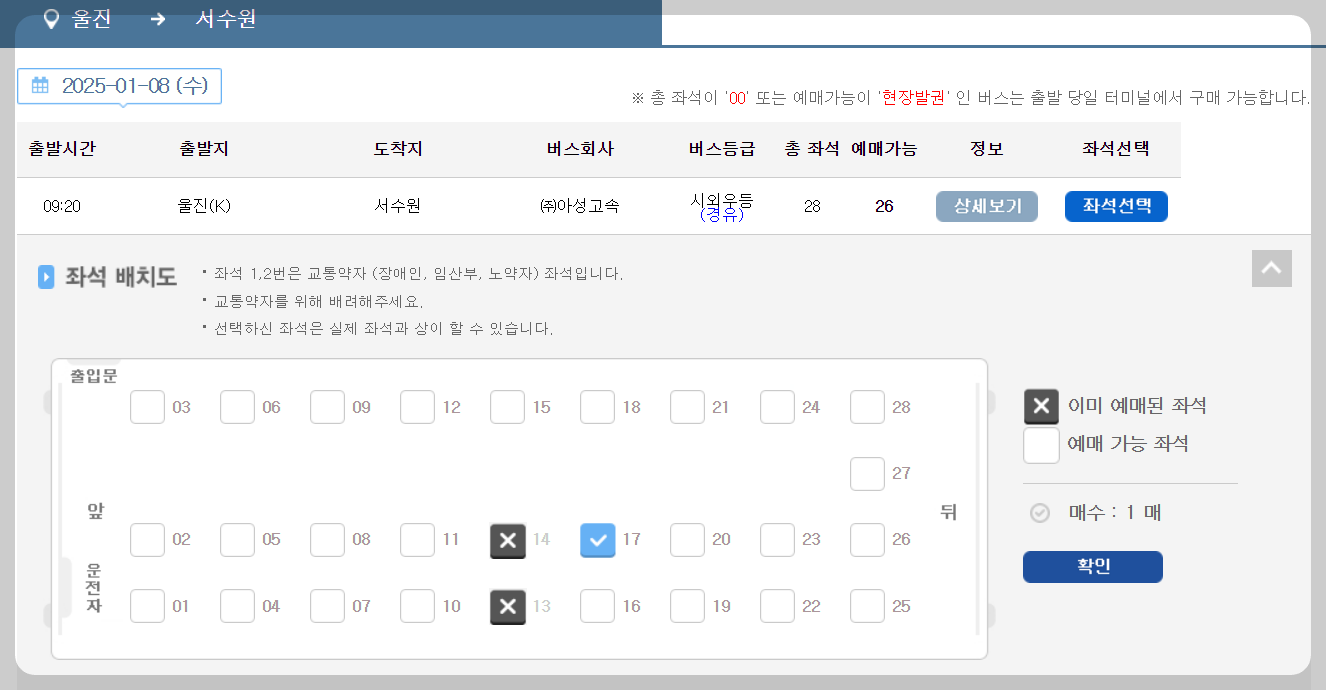 3️⃣ 잔여 좌석 확인: 원하는 시간대의 노선을 선택 후 예매를 진행하세요.