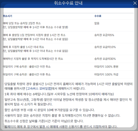 | 출발 1일 전 ~ 출발 1시간 전까지 | 운임 요금의 5% |