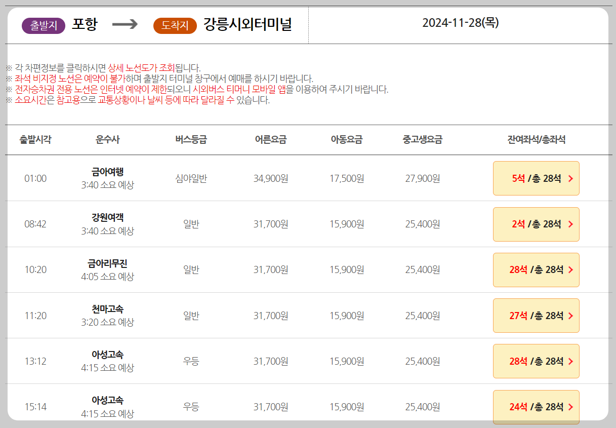 2️⃣ 날짜와 시간 선택: 출발 날짜와 시간을 입력하면 운행 노선과 잔여 좌석이 표시됩니다.
