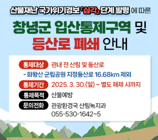 최근 바람이 많이 부는 건조한 봄 환절기 날씨라 산불 조심에 유의하셔야 합니다. 군립공원 내 5개 등산로 외 출입 제한이 되었습니다. 또한 즐겁고 간편한 산행이 목적이라면 편한 복장이 좋으며, 햇살이 강한 날에는 모자와 자외선 챙기는 것은 필수이니 참고하시면 좋겠습니다.😊