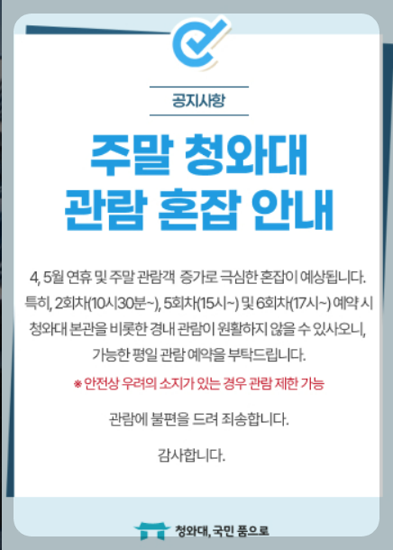 따스한 봄날, 우리 소중한 가족 친구 연인끼리 아름다운 청와대 관람도 하시며, 행복한 추억 보내시길 바랍니다.