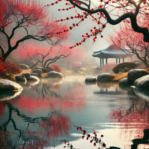 연못 위에 비친 홍매화는 또 다른 감성을 선사합니다. 특히, 바람이 없는 맑은 날에는 거울처럼 반영된 홍매화 사진을 촬영할 수 있어 더욱 환상적인 분위기를 연출할 수 있습니다.