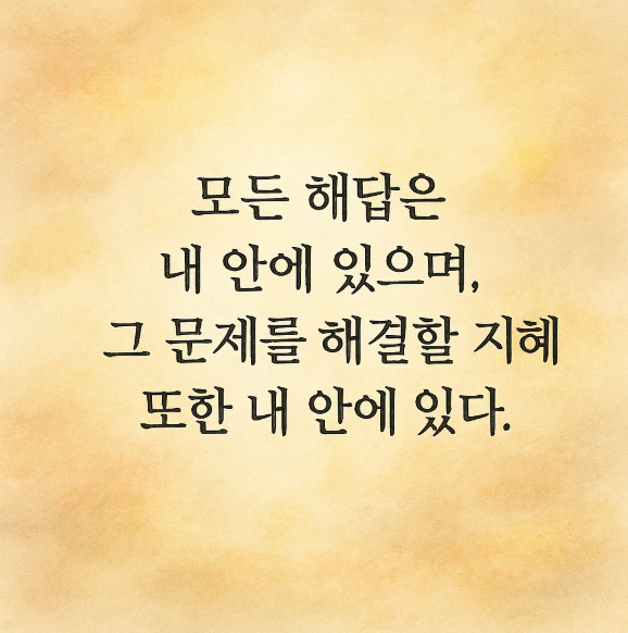 우리는 종종 바깥에서 해답을 찾으려 하지만, 진짜 중요한 해답은 이미 내 마음속, 내 경험 속에 담겨 있는 경우가 많습니다. 그 안에서 길을 찾고, 다시 시작하는 힘을 얻는 것입니다.