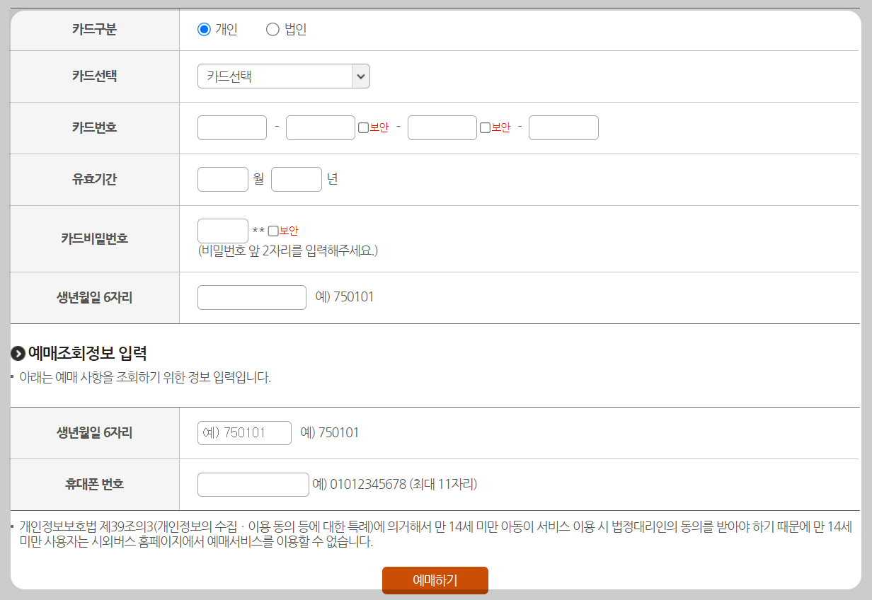 - 예약 시 사용한 카드를 지참하지 못한 경우, 카드 번호를 제시하여 처리할 수 있습니다.