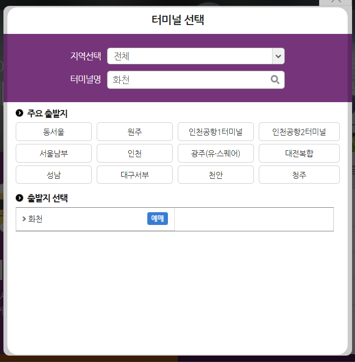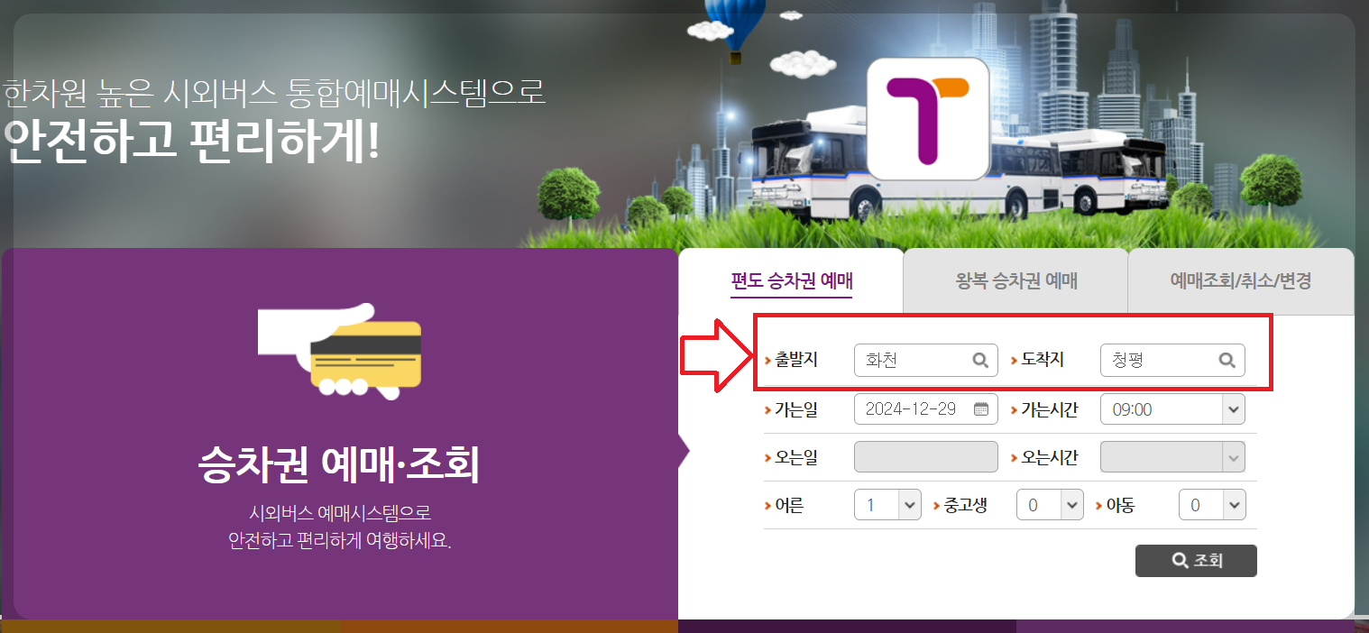 1️⃣ 출발지와 도착지 입력: 출발지를 ‘화천’, 도착지를 원하는 도시로 설정합니다.