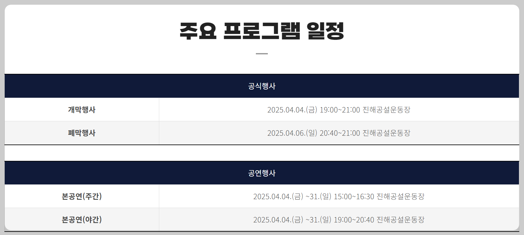 | 개막행사 | 4월 4일(금) | 19:00~21:00 | 진해공설운동장 |