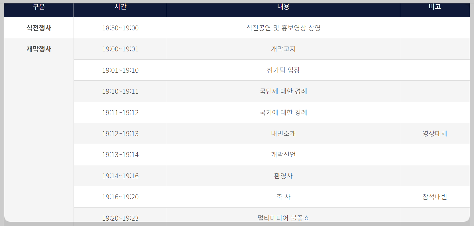 특히 개막식과 폐막식에서는 멀티미디어 불꽃쇼와 함께 다양한 공연이 펼쳐집니다.
