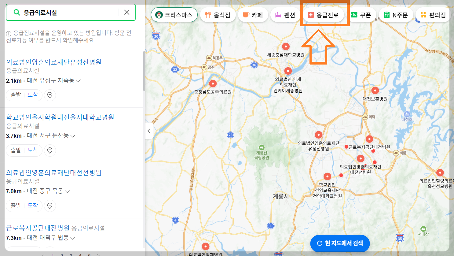 - 검색창에 "24시 병원", "응급실" 입력